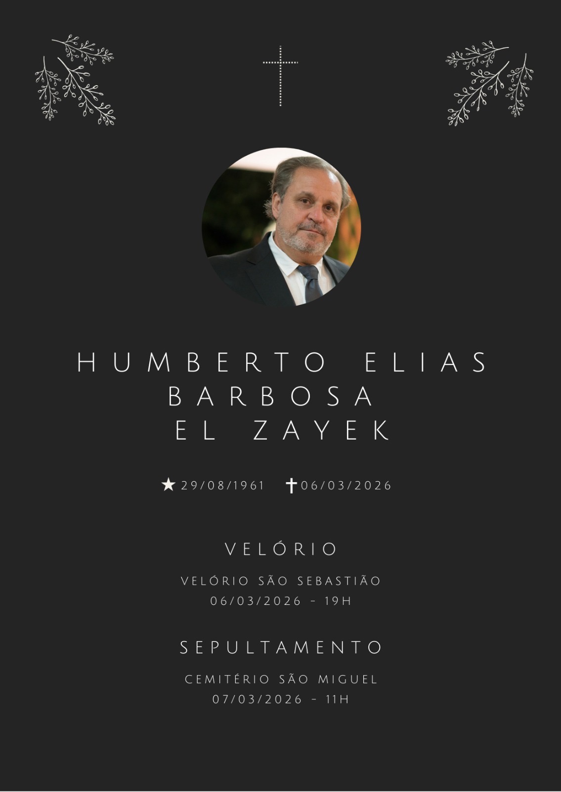 O empresário anapolino Humberto El Zayek morreu nesta sexta-feira (6), aos 64 anos. Ele teve atuação destacada no meio empresarial de Anápolis e ocupou cargos importantes ao longo da carreira, entre eles o de diretor de operações da Urban – Mobilidade Urbana Anápolis e da TV Tocantins (Hoje, TV Anhanguera) no município.