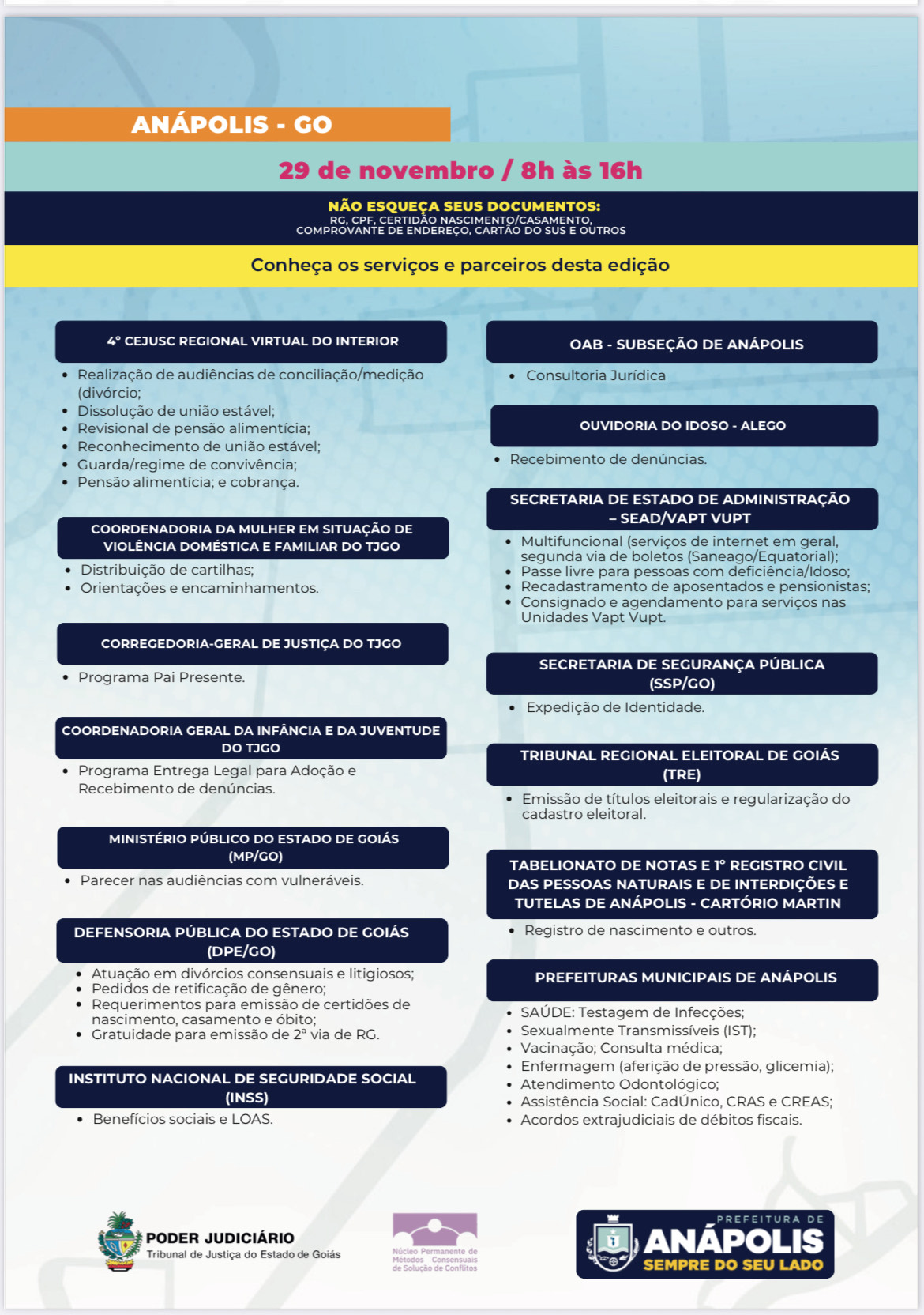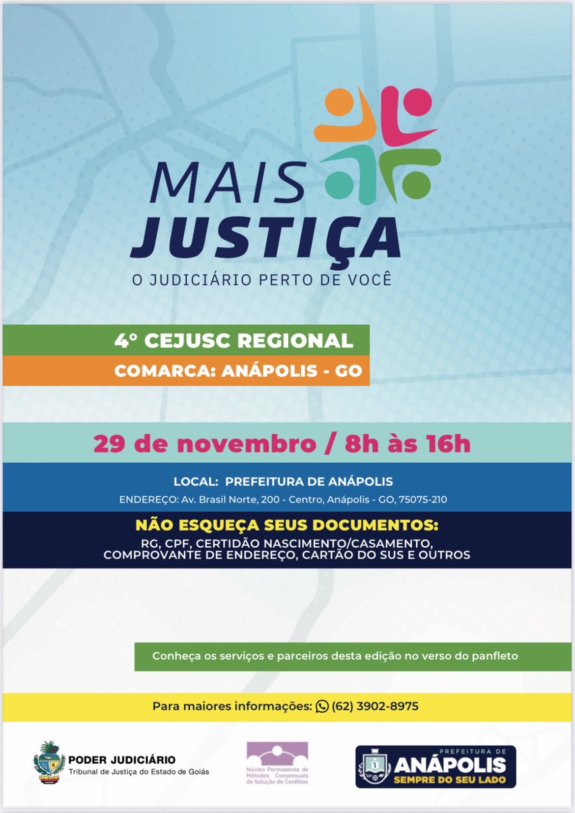 Anápolis receberá, no próximo dia 29 de novembro, mais uma edição do programa Mais Justiça – O Judiciário Perto de Você, promovido pelo Tribunal de Justiça do Estado de Goiás (TJGO). O evento será realizado das 8h às 16h, na Prefeitura de Anápolis, localizada na Avenida Brasil Norte, nº 200, Centro.